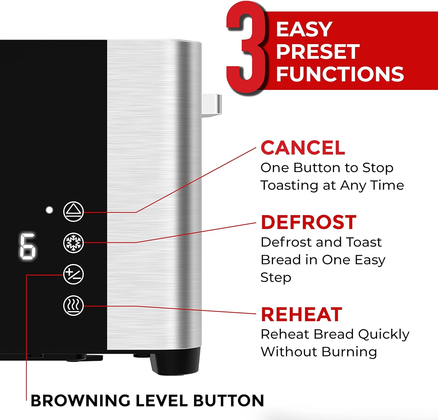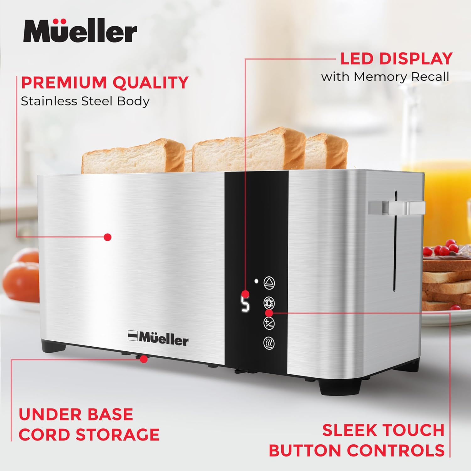 Mueller UltraToast Full Stainless Steel Toaster 4 Slice, Long Extra-Wide Slots with Removable Tray, Cancel/Defrost/Reheat Functions, 6 Browning Levels with LED Display, Kitchen Essentials & Gadgets